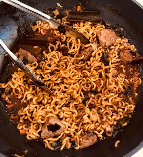 韓国料理の、トッポッキの中にラーメンが入っているものです。